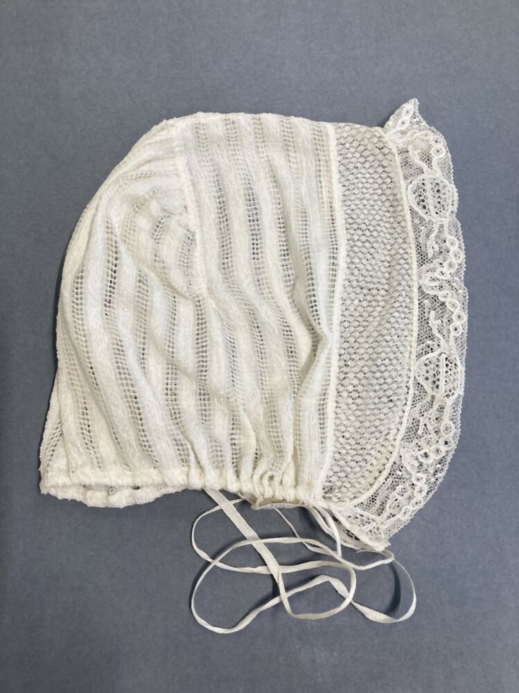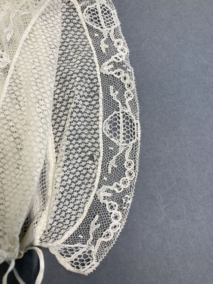 Witte cornetmuts met bol van gestreept ajourweefsel en een strook van ajour breiwerk afgezet met Rijssels kloskant