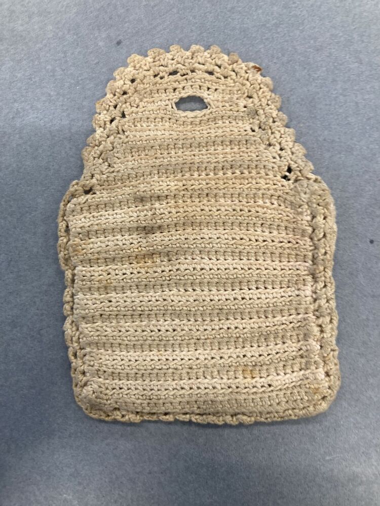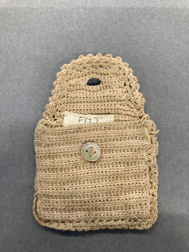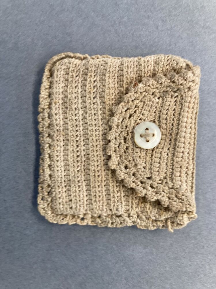 Klein beursje voor muntgeld, gehaakt van roze-beige katoen in strepen, klep met parelmoer knoop