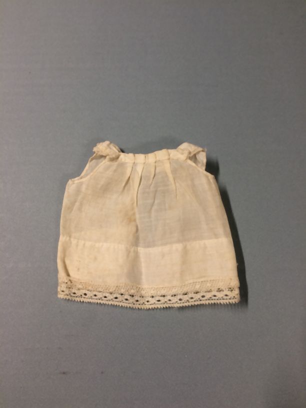 Poppenschort zonder mouwen van dunne katoen, langs schouders en onderkant afgezet met bandje