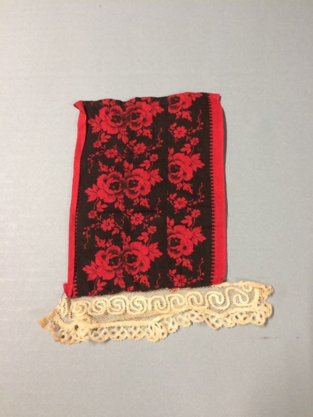 Poppenlakentje met kantje, gemaakt van drie banen, rood-zwarte bedrukte stof