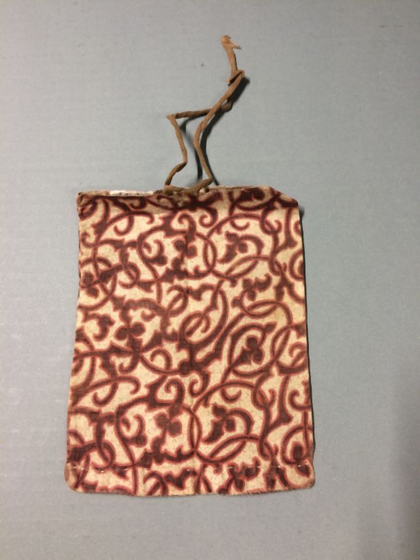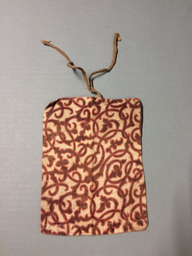 Rechthoekig kussensloop, bedrukt met rood-bruin gekleurd patroon, sluiting door middel van bandje