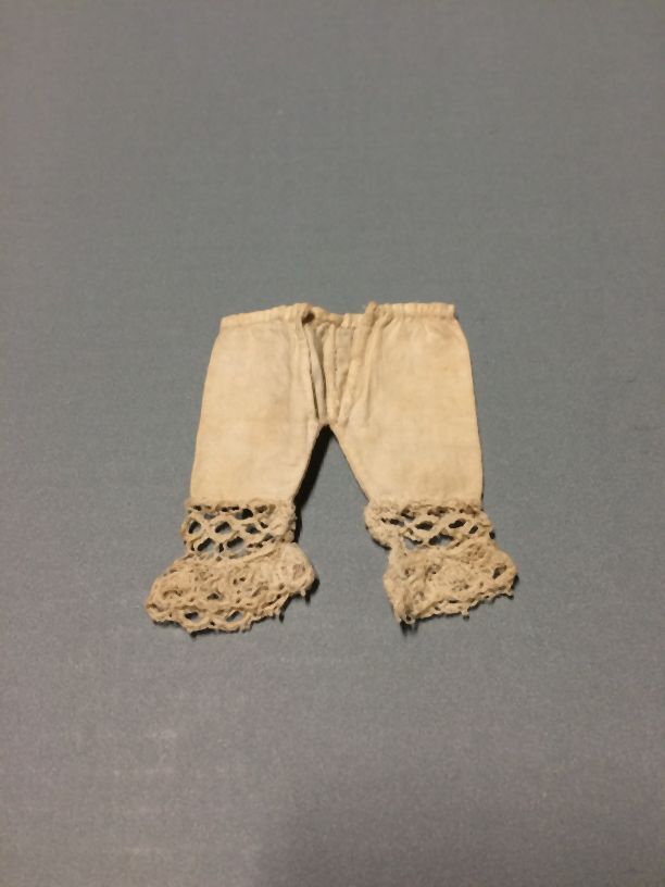 Wit katoenen onderbroek met lange pijpen voor pop, aan onderkant versierd met kant