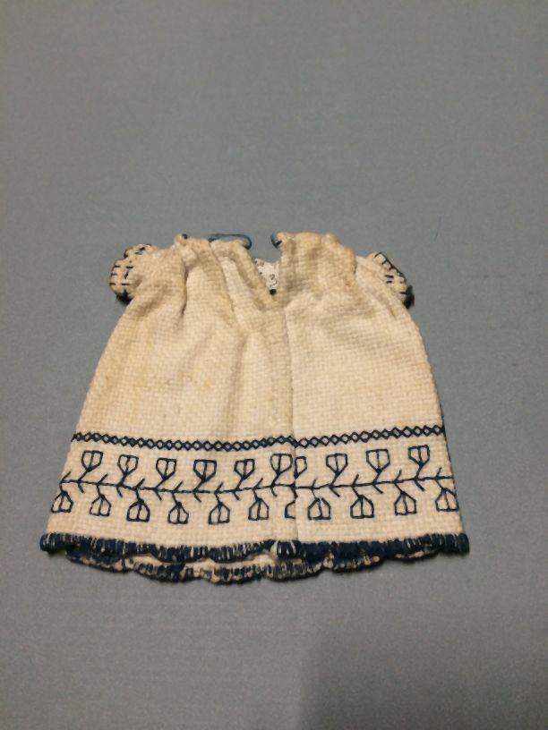 Poppenjurk van wit katoen in matting binding, geborduurd met blauw garen