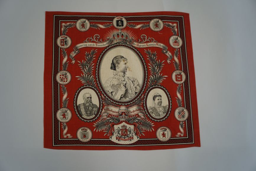 Gedenkdoek met rood fond ter herinnering aan de troonsbestijging van Hare Majesteit Koningin Wilhelmina