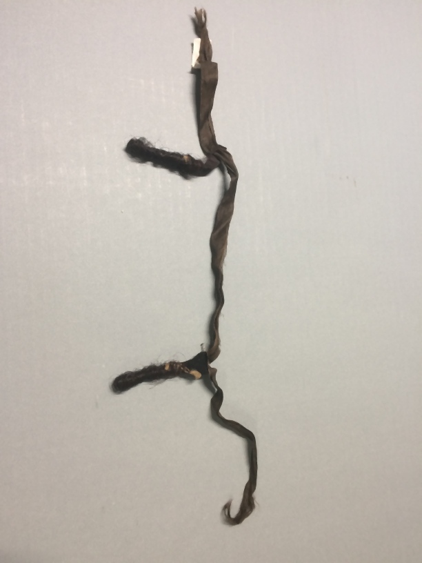 Hindelooper haarlokjes, band waaraan twee losse pijpekrullen, donkerbruin zijden band met zwarte stijve lokjes