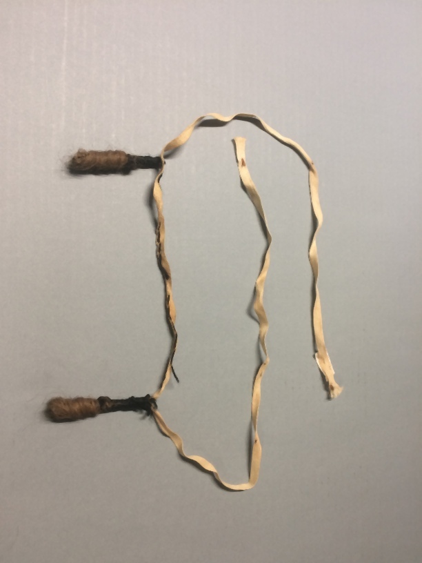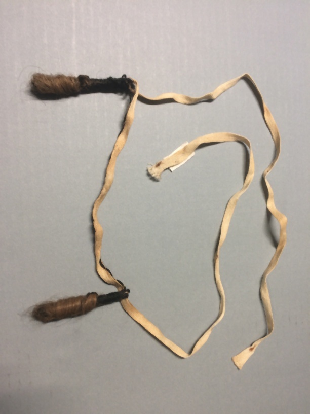 Hindelooper haarlokjes, band waaraan twee losse pijpekrullen, wit linnen veterband met donkerblonde lokjes en zwarte wol
