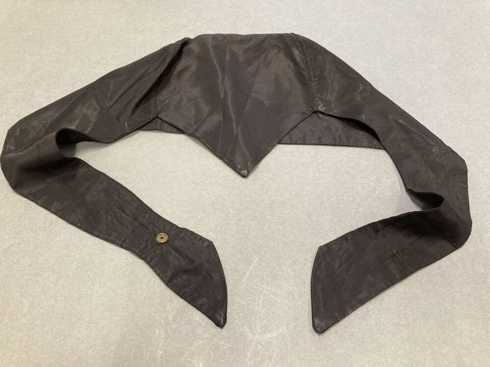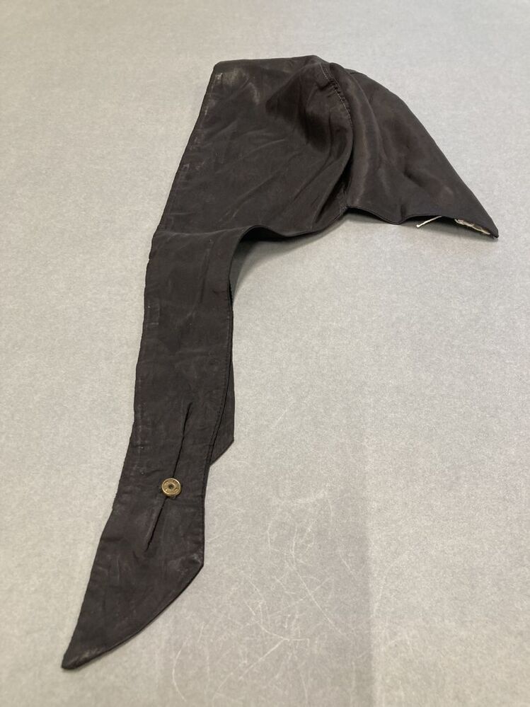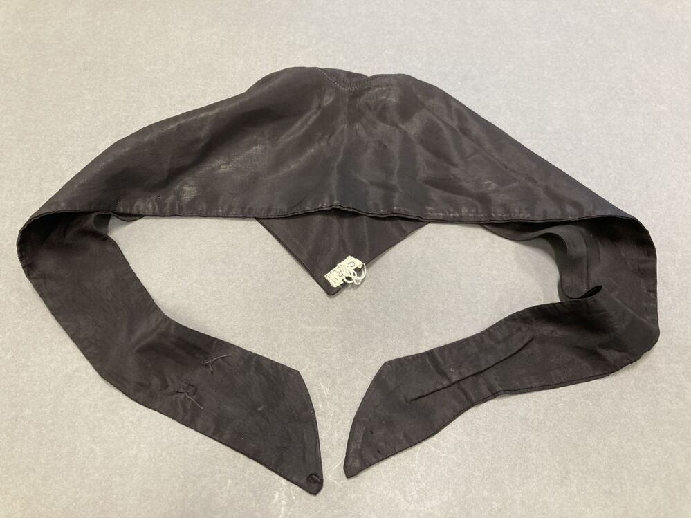 Zwart mutsje van kunstzijde met punt in nek en kinbanden