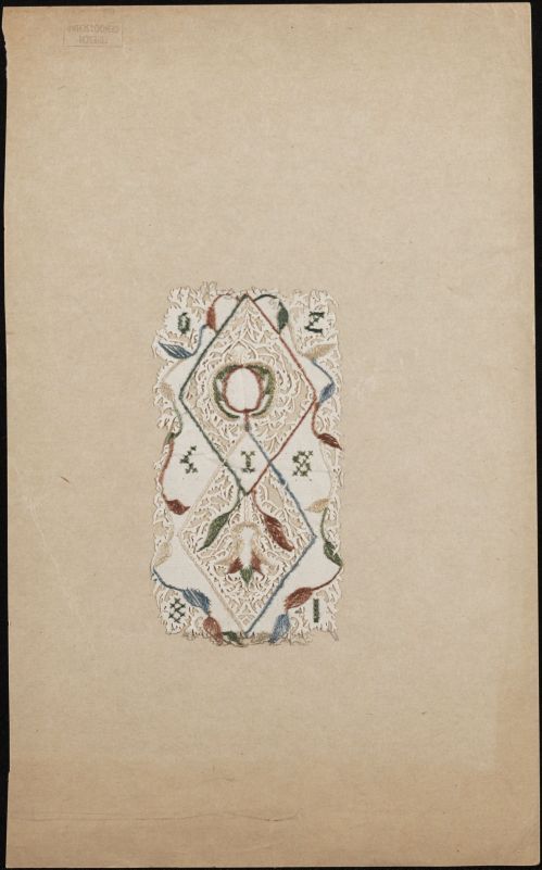 Knipsel van papier, geborduurd met groen, beige en rode zijde en op papier geplakt, ajour bloemboeket