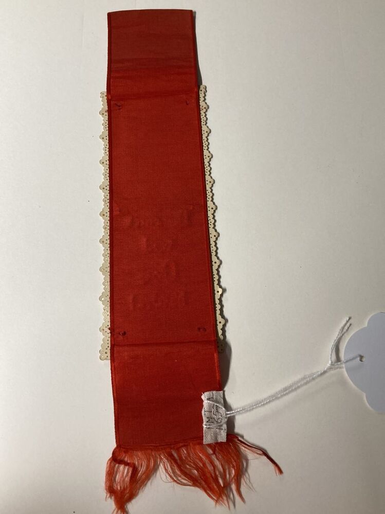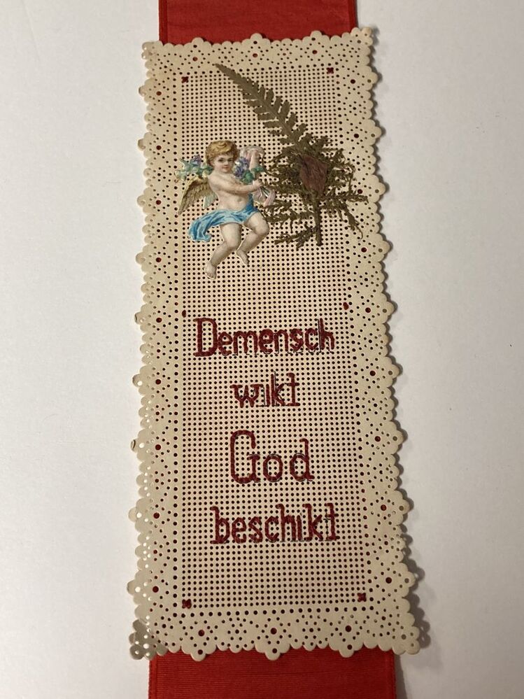 Boekenlegger van rode kunstzijde, met geperforeerd papier, poezieplaatje met tekst