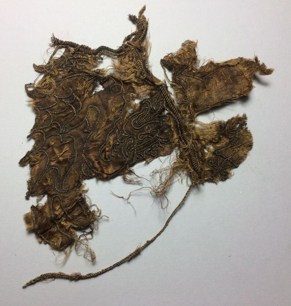 Fragment van zijde met opgenaaid draad in de vorm van een gekroonde draak