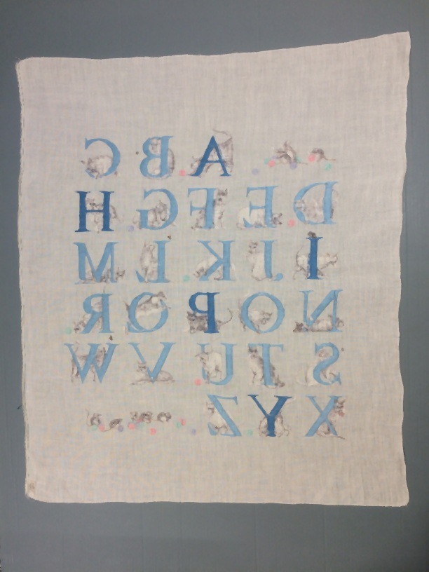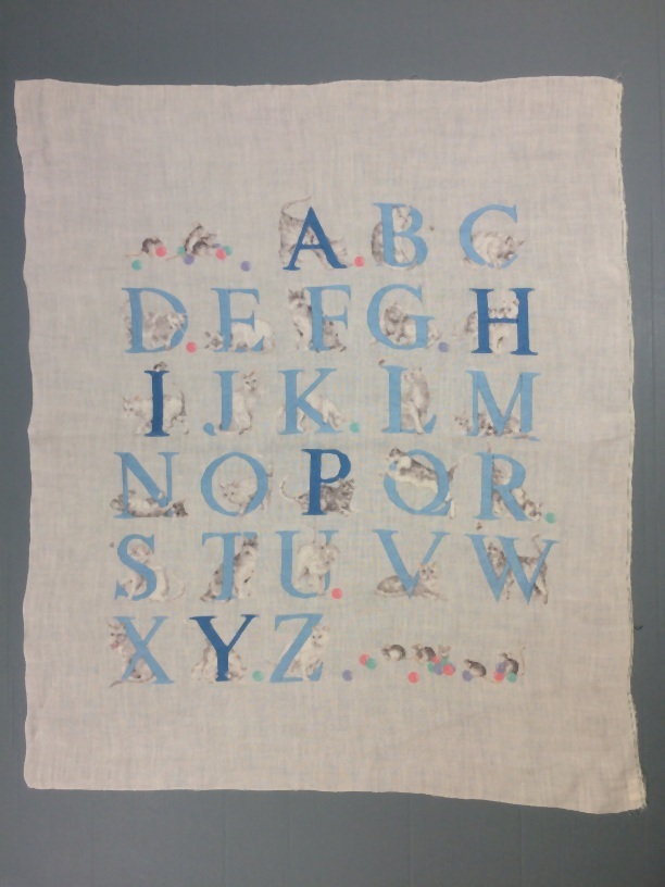 Letterlap geborduurd met katoenen mouliné op linnen, alfabet, hoofdkleur in blauwtinten, met lichtblauwe en grijze poezen en muizen