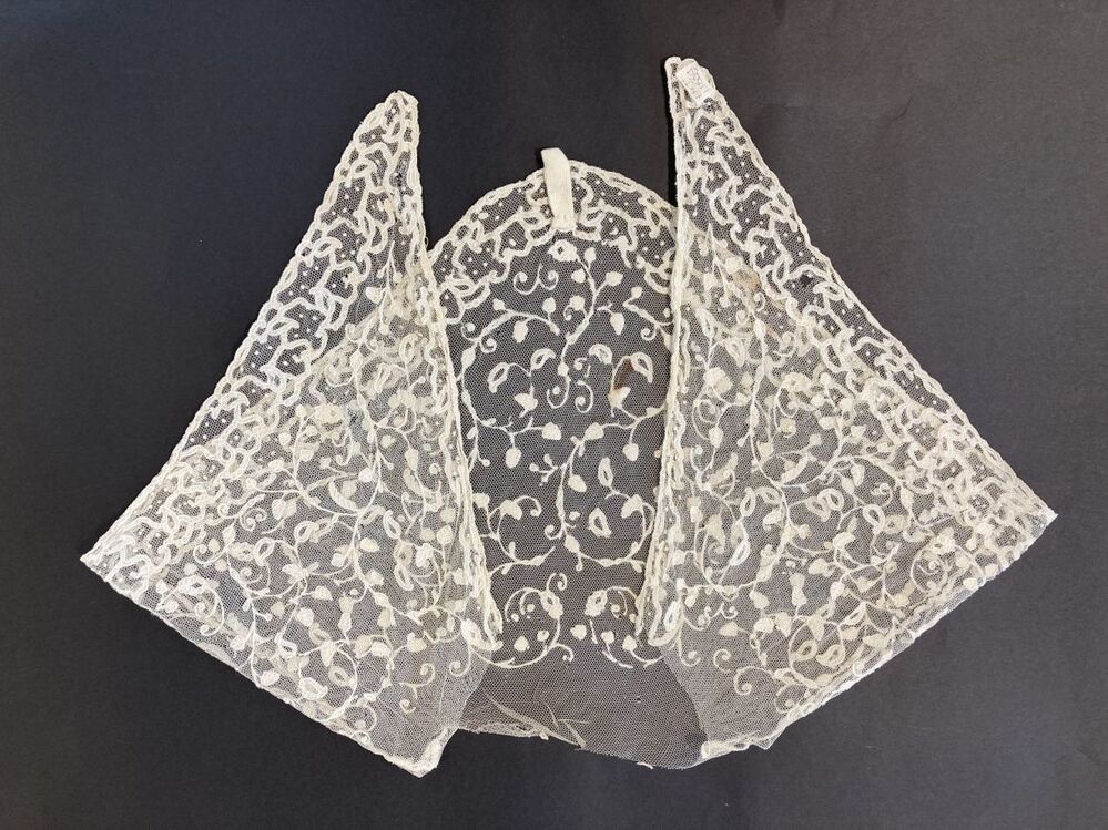 1) hals- of hoofddoek die met een tip (uiteinde) op de rug wordt vastgespeld. https://data.cultureelerfgoed.nl/term/id/cht/00c8692f-af9f-490f-b4ec-ec045b417f30