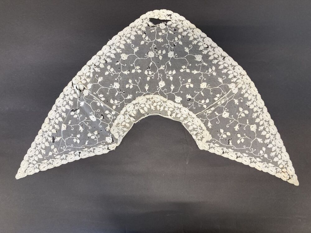 Witte tipdoek met kraag en schoudernaden van fijne tule met applicatie die naderhand is geborduurd