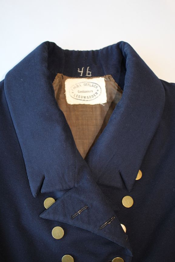 Frac, mannenjas met weggesneden panden van donkerblauw laken, diepe V-hals met revers met M-vormige inkeping en metalen knopen
