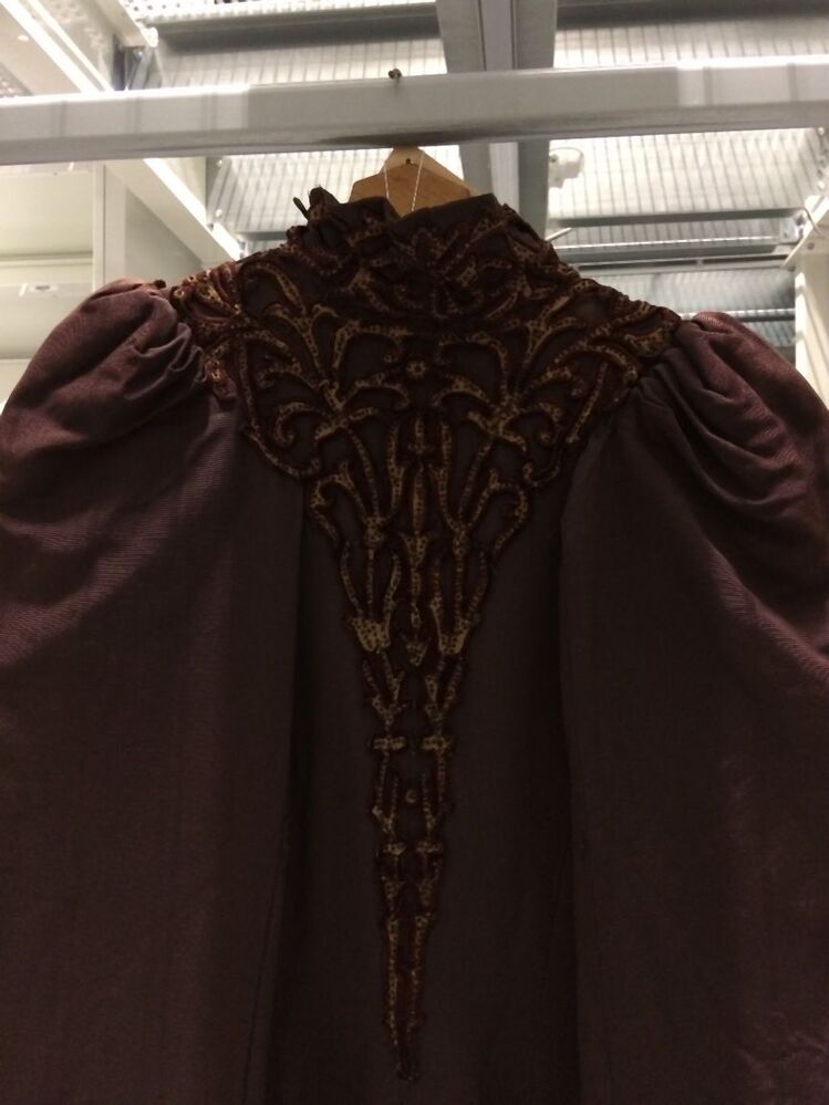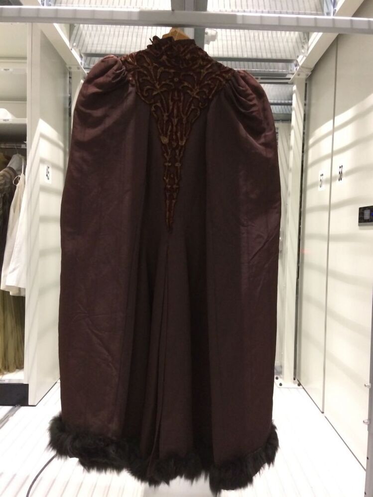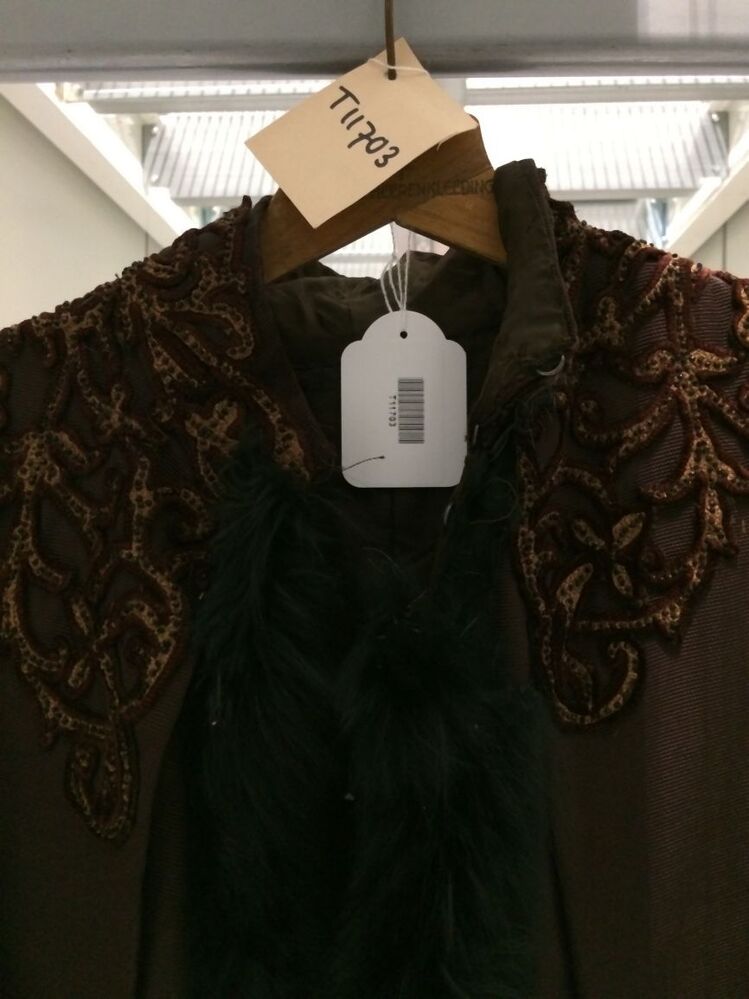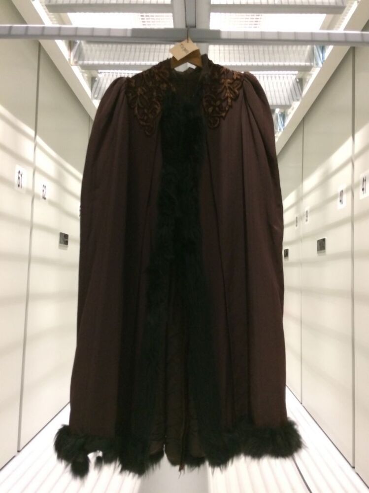 Slanke lange avondcape van donkerbruine ribszijde met opstaande kraag, 'kopmouwen', applicatie van floraal motief met kralen, zwart bont langs opening en zoom, gewatteerde voering