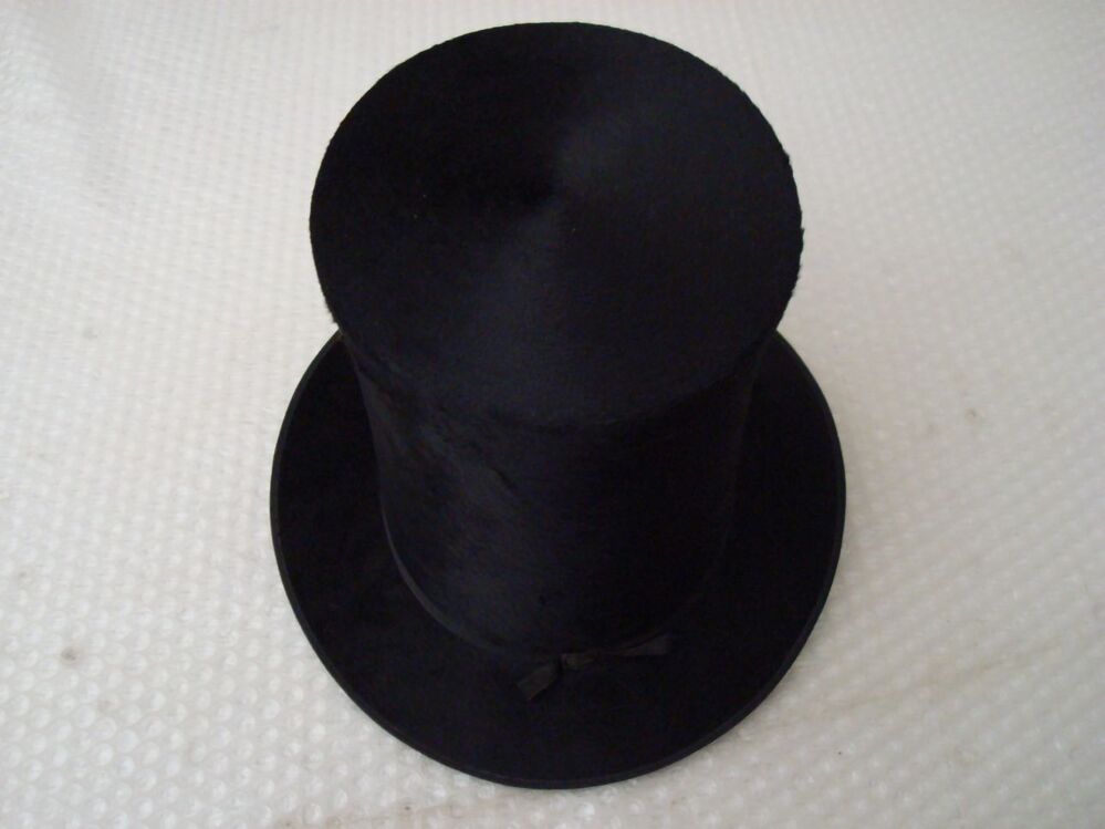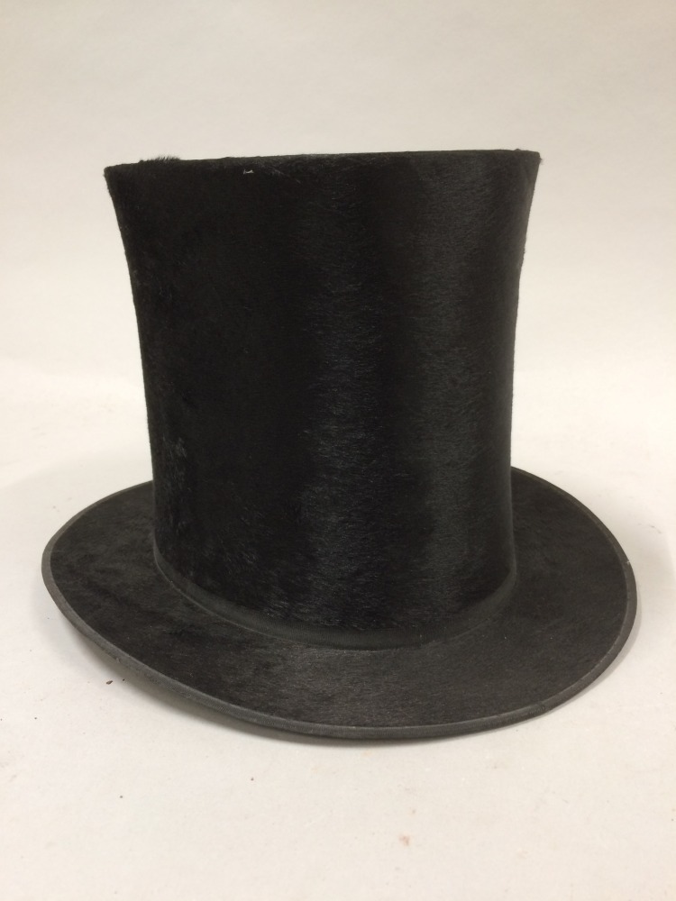 Hoge hoed met iets uitlopende bol van zwart zijden velours met vlakke rand