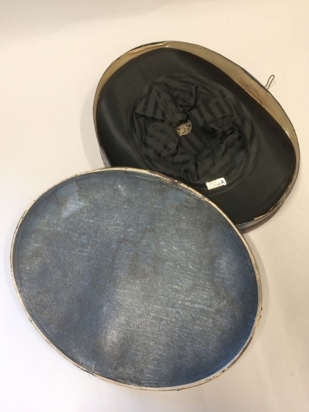 Uitklapbare hoge hoed (A), chapeau claque van zijden satijn in bijbehorende blauwe, ovale, kartonnen doos (B)