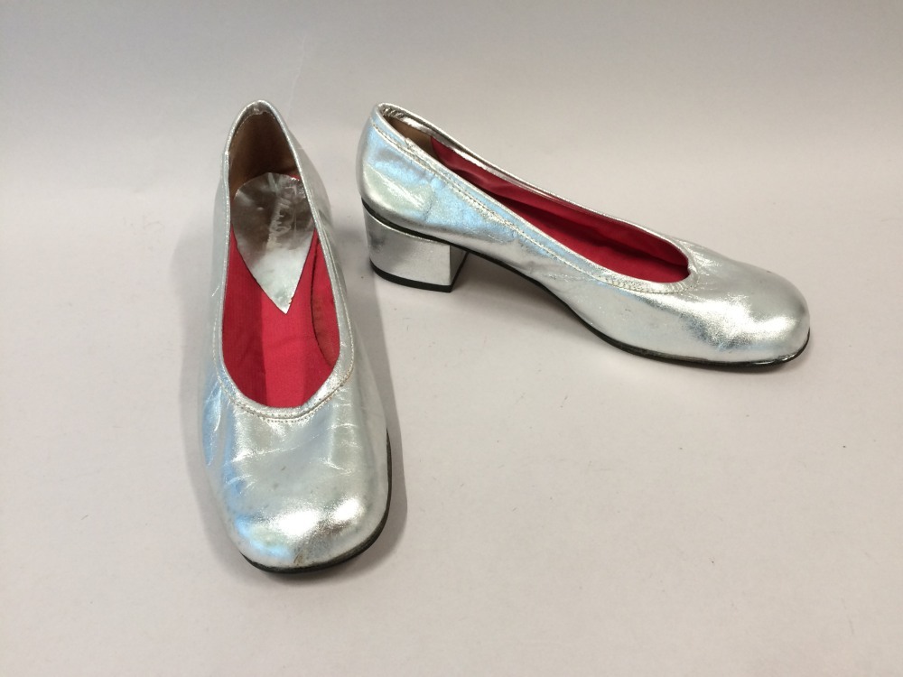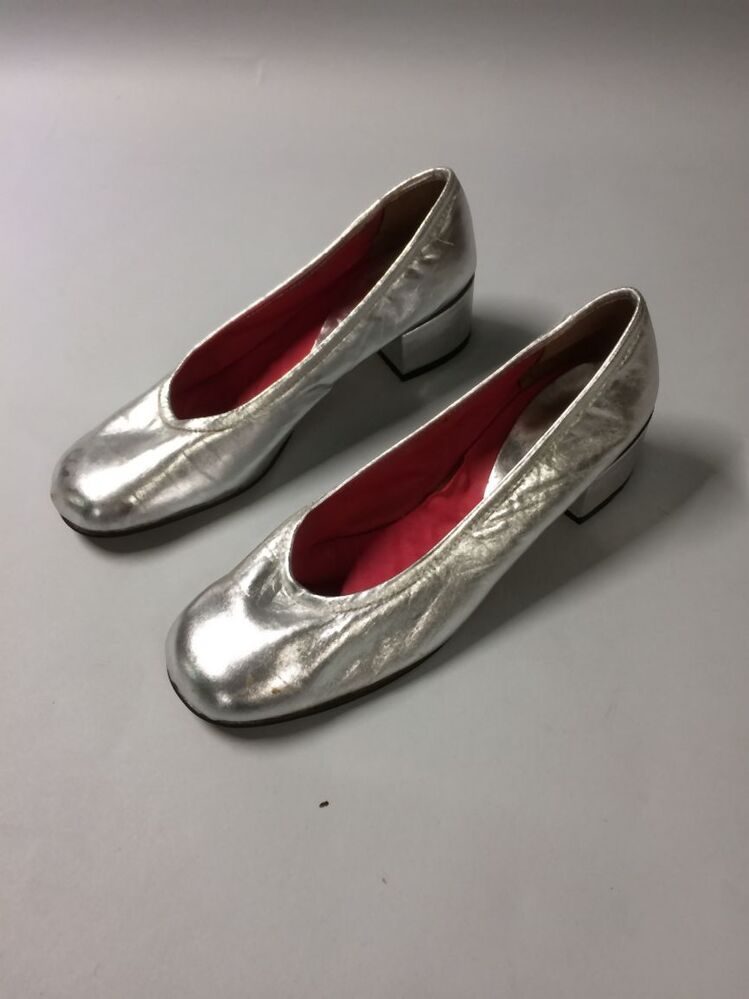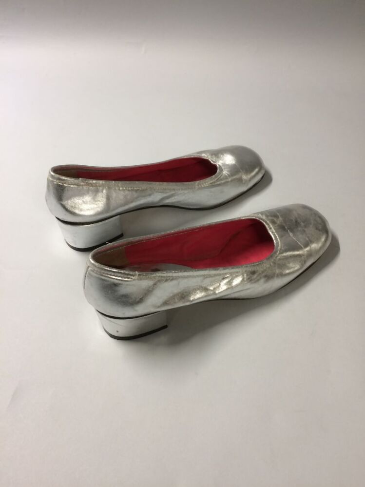 Paar zilverkleurige schoenen met ronde neus en kleine blokhak