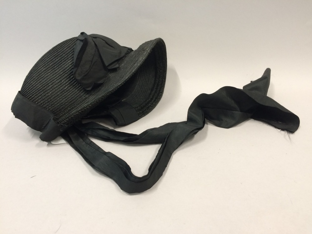 Luifelhoedje voor weesmeisje met zijden strik en rand gevlochten paardehaar langs gezicht