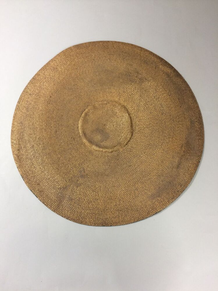 Platte hoed gevoerd met geel zijden damast met groot bloempatroon