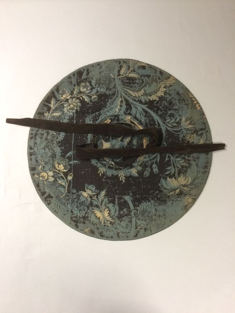 Platte hoed van zigzag-stroband gevoerd met zwart en blauw zijden damast met witte randen en met fluwelen keelband