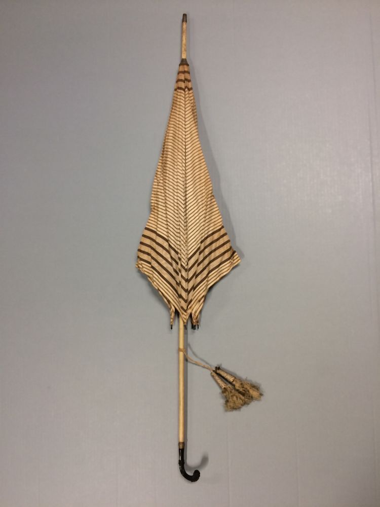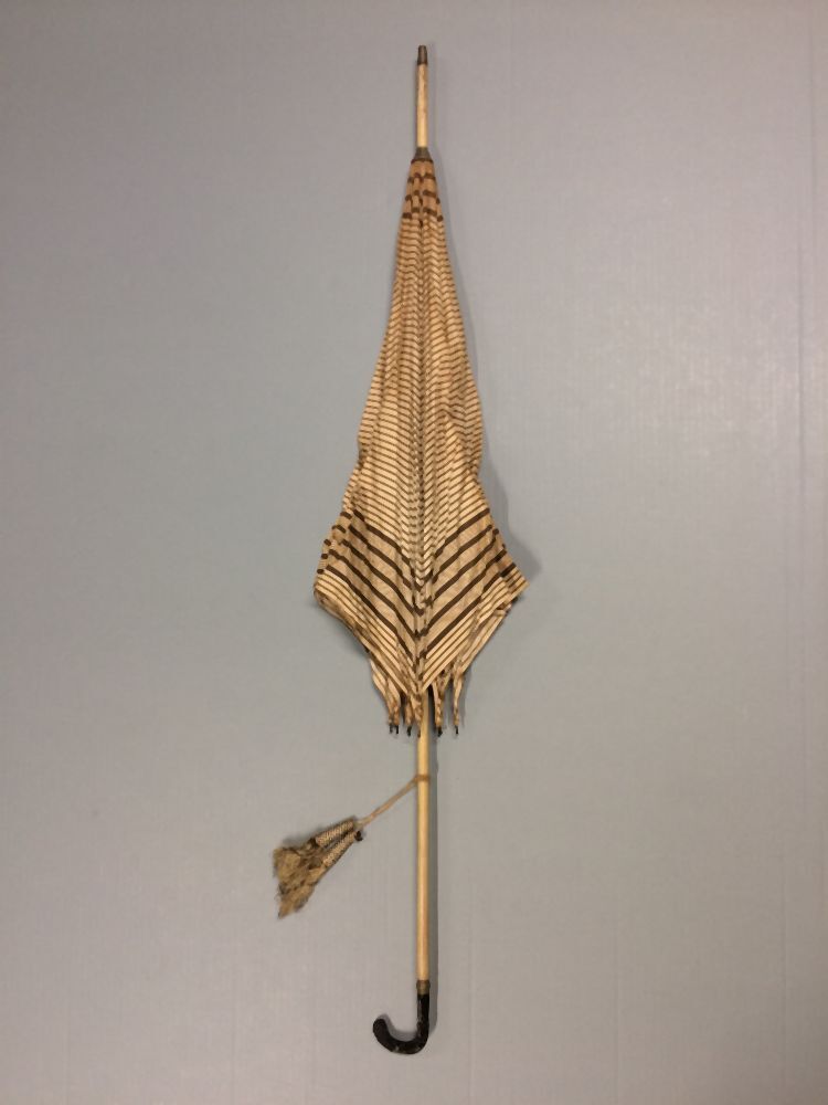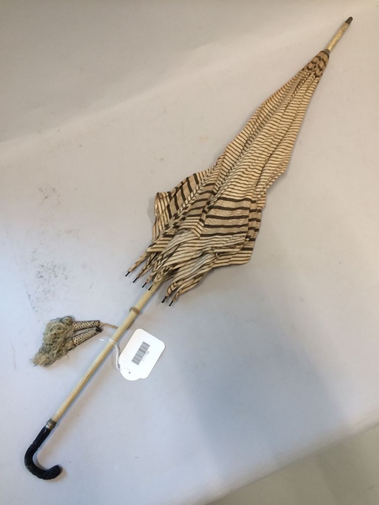 Grote parasol van dun wit met bruin gestreept katoen en wit geverfde steel met klein zwart ebonieten handvat