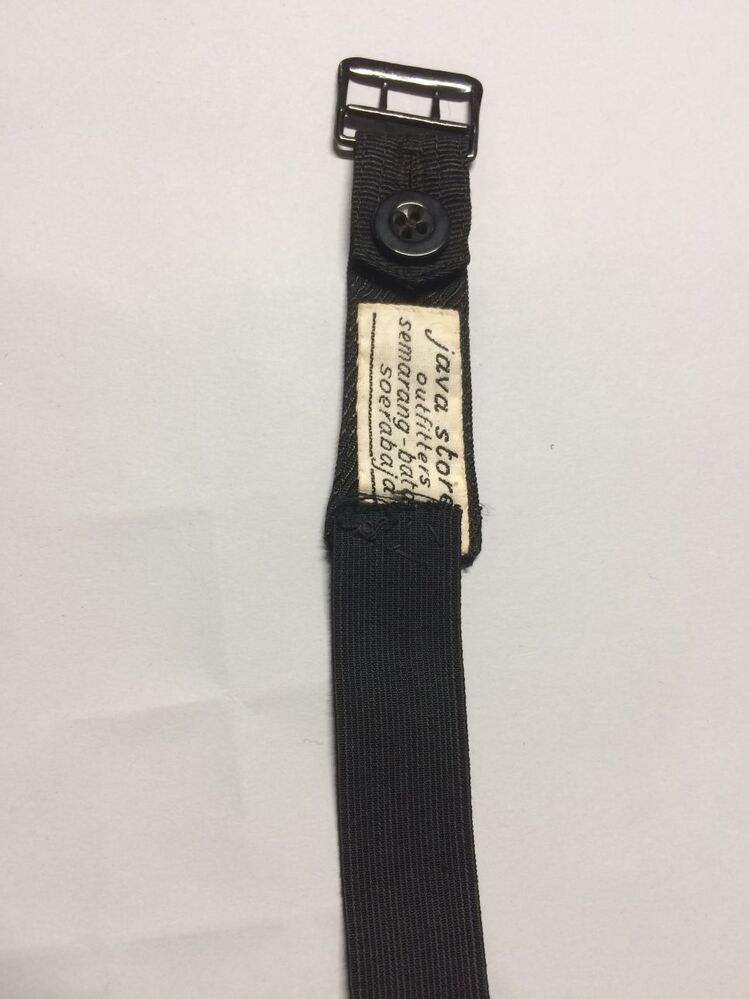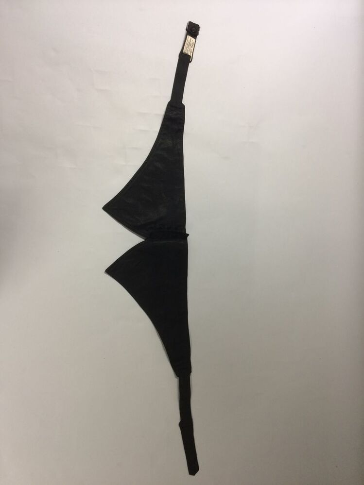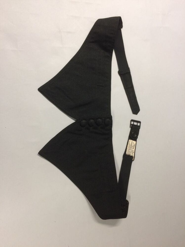 Vest van zwarte ribszijde, brede ceintuur met middenvoor vier knoopjes, spitse 'vestpunten' met aan weerszijden een zakje