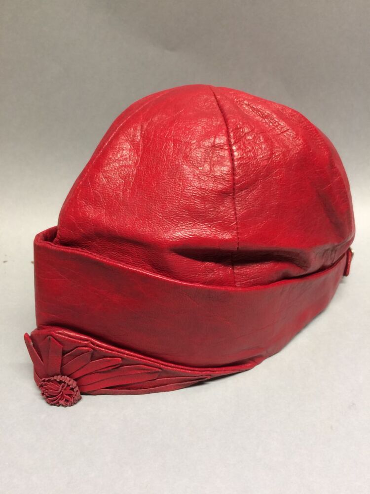 Rood leren damesmotorkap met dubbele opgeslagen rand en gestileerd bloemmotief middenvoor, gesp middenachter