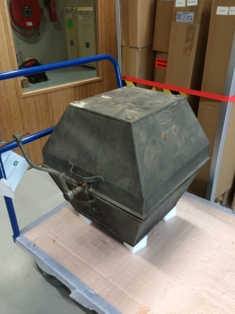 Vierkante metalen trommel met zeshoekige omtrek, opzij opening, in het midden, te plaatsen op kachel, met kraantje met daarin wastrommel met draaihendel