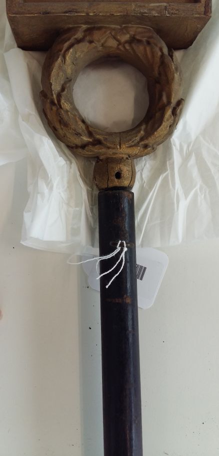 Verticale draagstok voor het vaandel. Aan de bovenzijde van de vaandelstok is de horizontale vaandelhanger bevestigd, waaraan het vaandel aan banden is opgehangen. https://data.cultureelerfgoed.nl/term/id/cht/5739eec1-80ef-4e98-9b9d-92debb469aa9