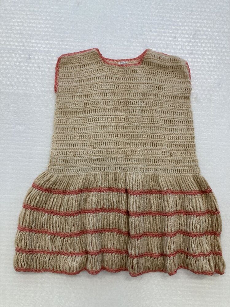 grof gehaakt wollen meisjesjurkje met verlaagde taille, van ecru wol en zalmroze rayon.