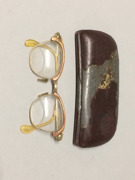 Vlinderbril met geel en koperkleurig montuur in gehavende roodbruine brillenkoker