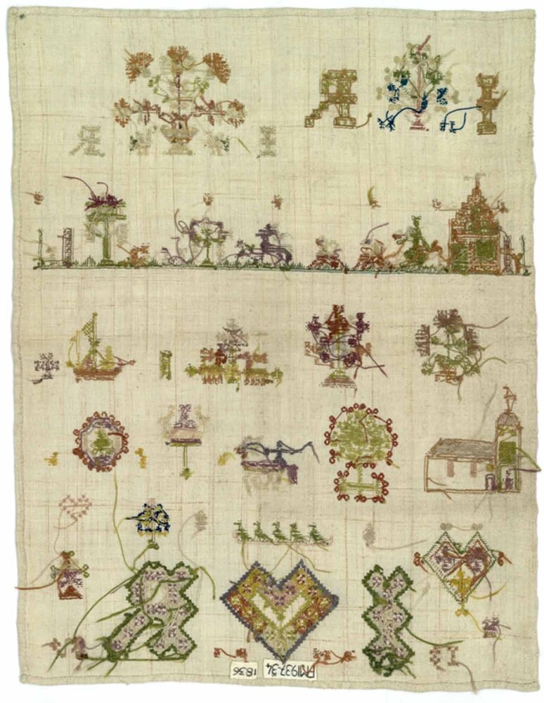 Textielwerken, meestal van fijne stof, waarop door vrouwen en meisjes in verschillende steken is geborduurd en die bedoeld zijn om in te lijsten. Ze werden doorgaans gemaakt door beginnelingen om hun vaardigheden te tonen. Kenmerkend zijn een combinatie van steken, motieven, letters en verzen, en vaak de voltooiingsdatum en de naam van de borduurster. (AAT-Ned)