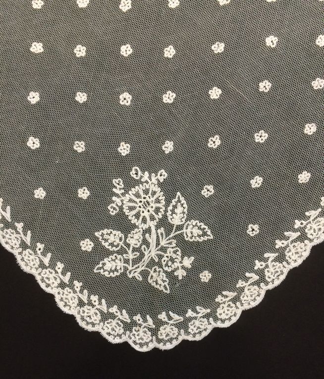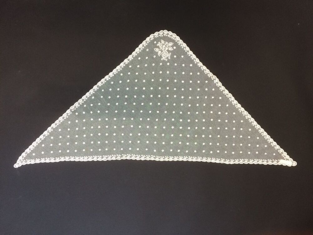 Fichu van witte katoenen tule versierd met tamboereerwerk met in de rechte hoek een bloemmotief, de rechte hoek is afgerond