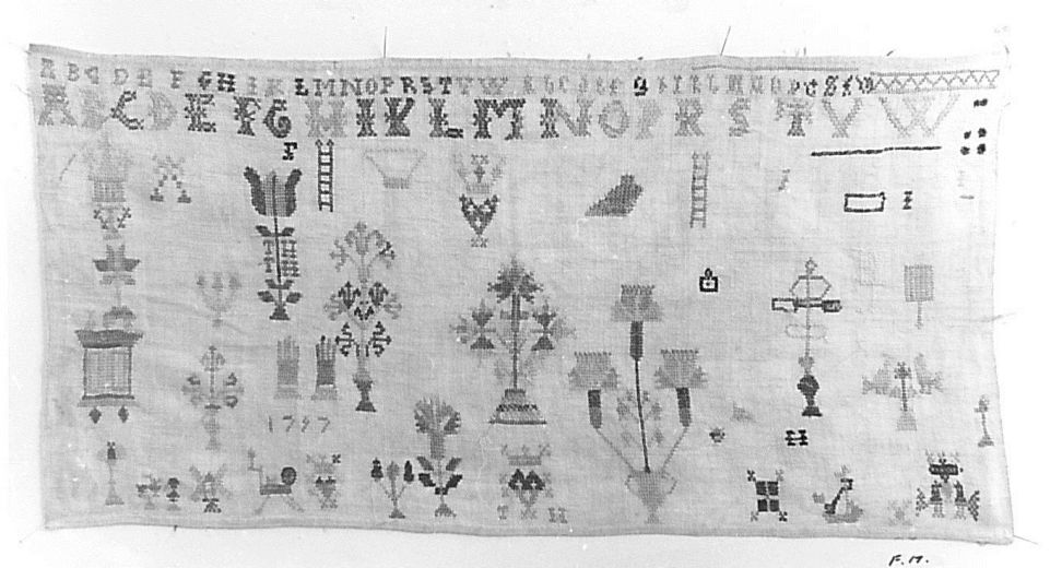 Merkletterlap met twee rijen alfabetten en verspreide motieven, TH, 1797
