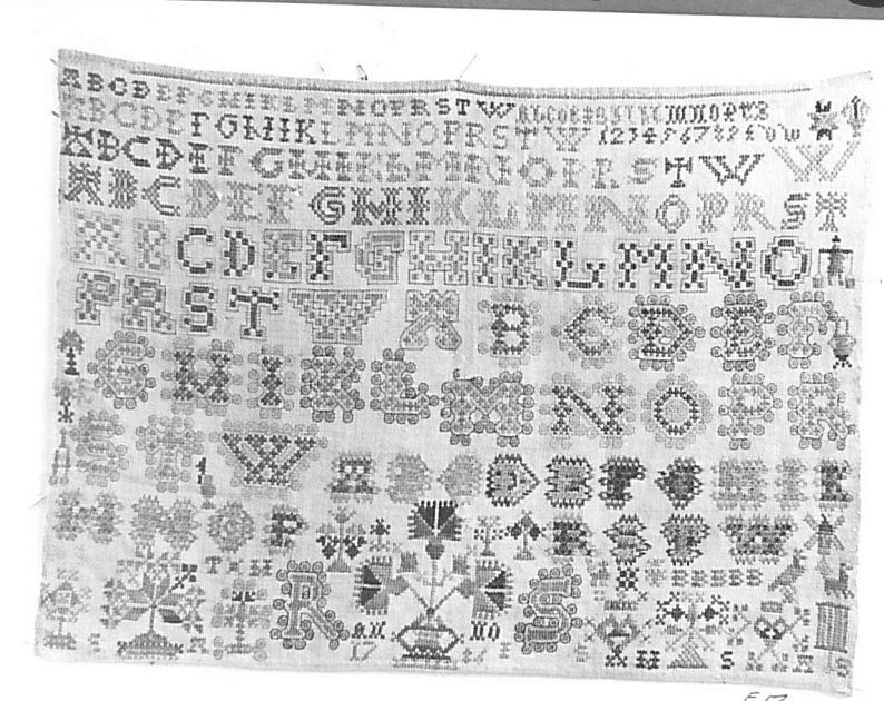 Lettermerklap van linnen, geborduurd met zijden garen, met negen rijen alfabetten, enkele merken en vijfmaal de B