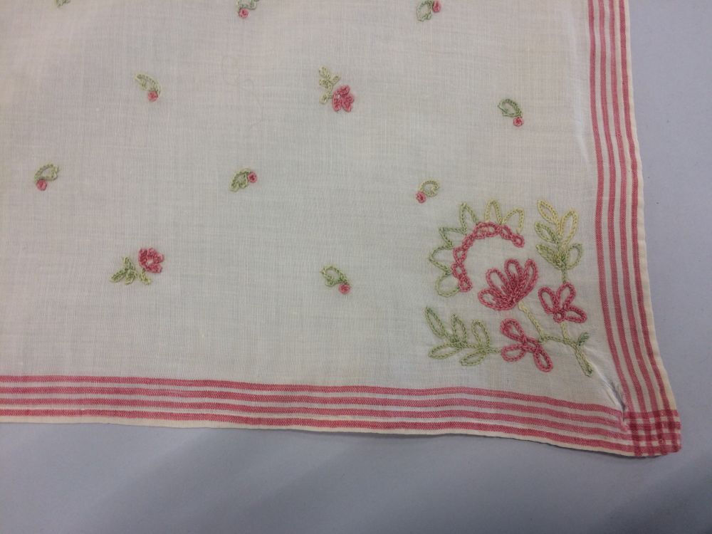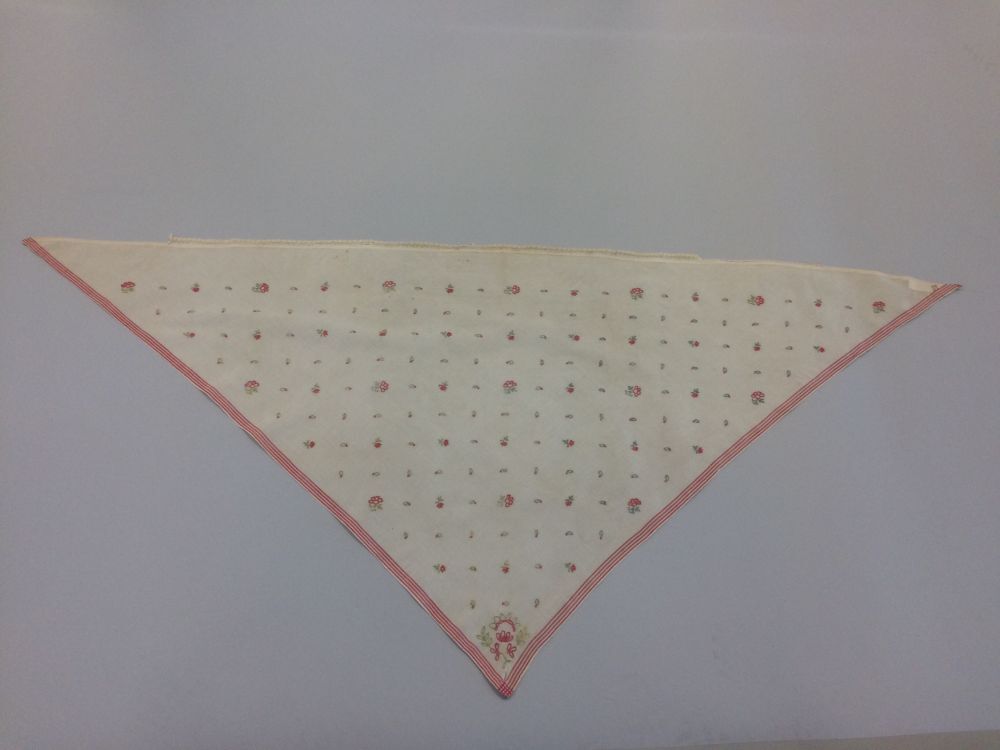 Driehoekige witte fichu met roze-rood en groen tamboureerwerk bloempjes, met kantje