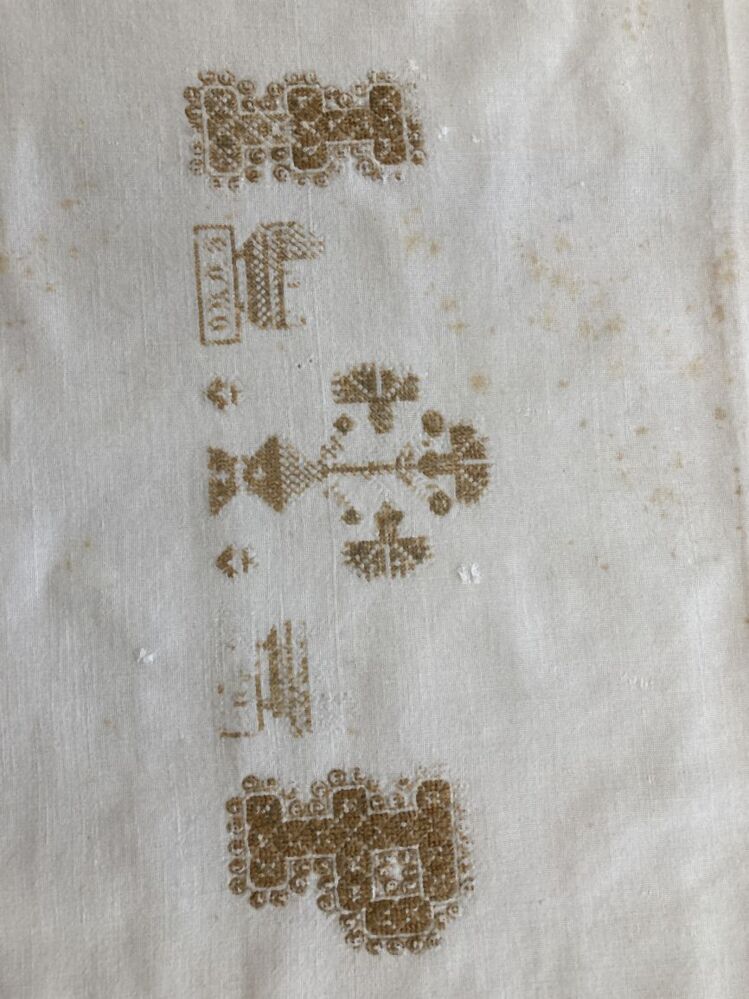 Wit linnen wiegenlakentje met okerkleurig zijden kruissteek initialen IP en traditionele motieven