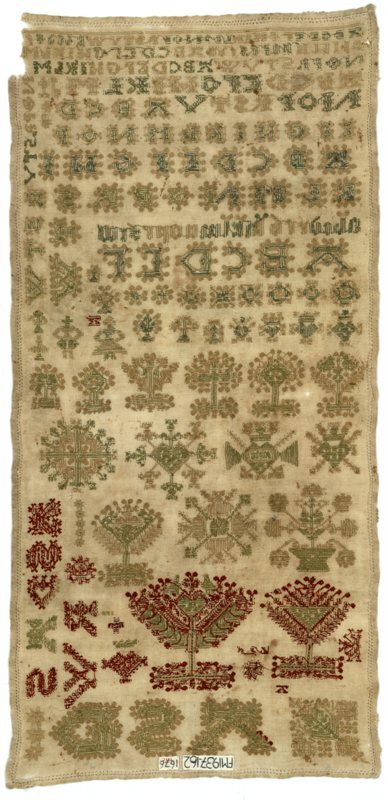 Merkletterlap met beige groen en rood, gemerkt A.S.D., 1676