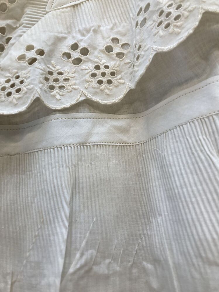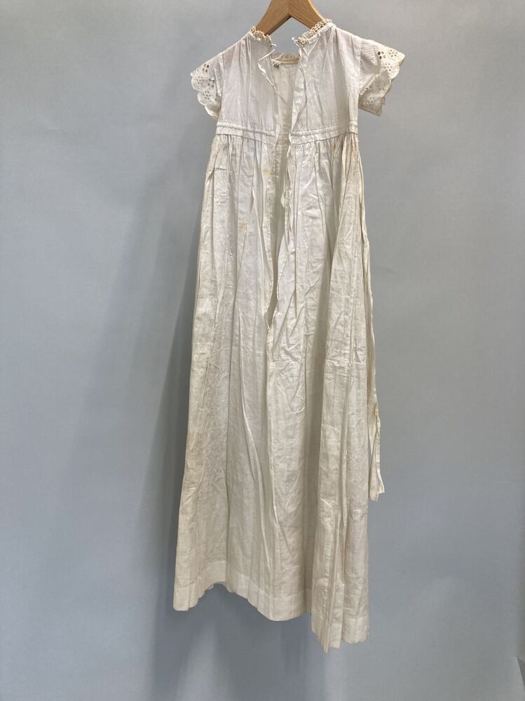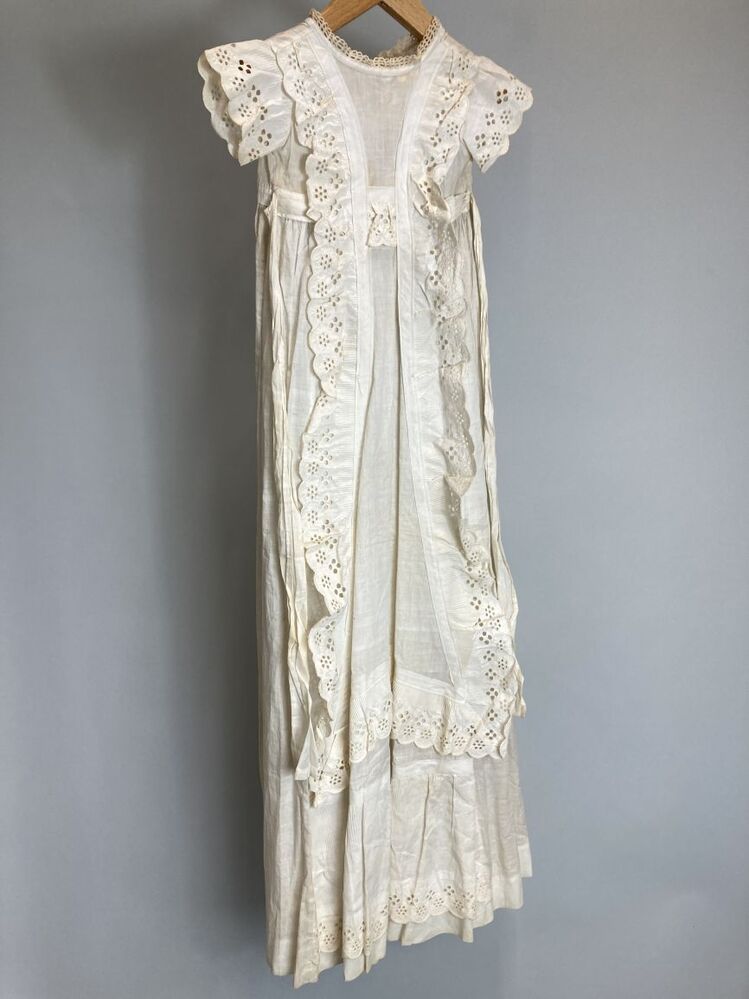 Wit katoenen doopjurk met schortvormig paneel , afgezet met broderiekant