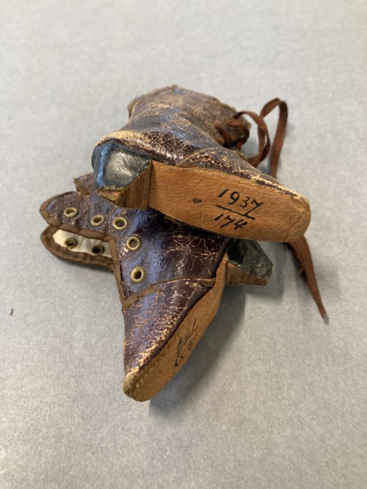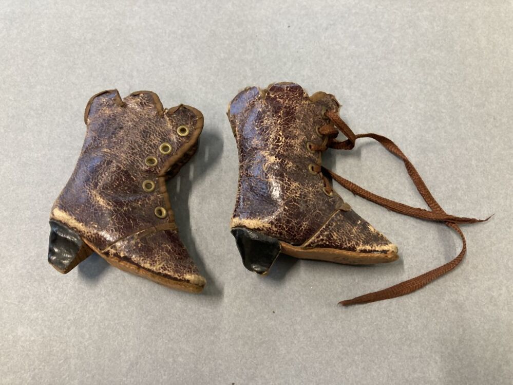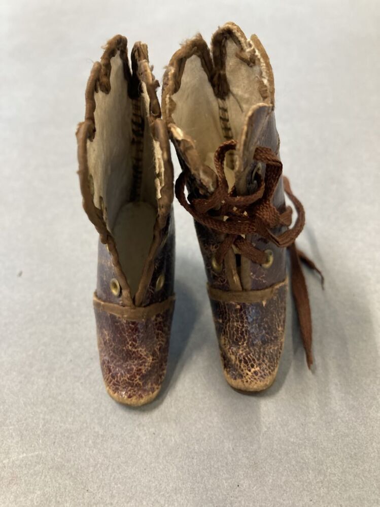 Hoge rijglaarsjes voor de pop van bruin wasdoek met leren zool
