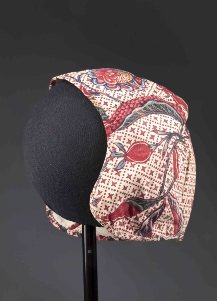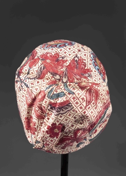 Sitsen jongensmuts, beschilderd met raster waarover patroon van diverse bloemen op witte grond
