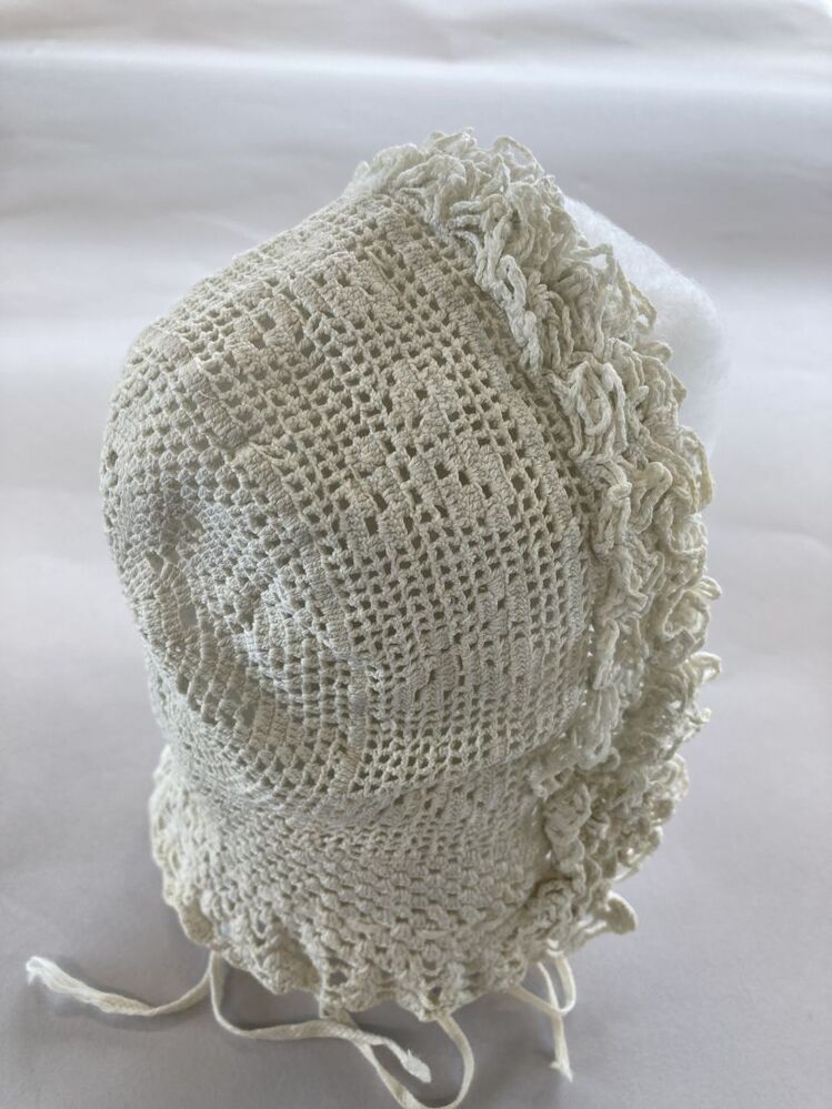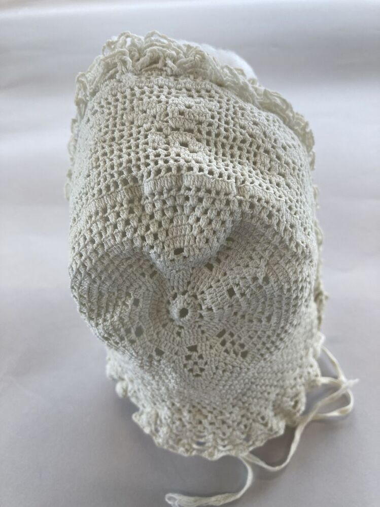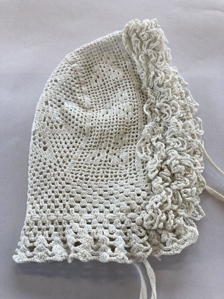 Wit katoenen gehaakte muts met 10-puntige ster in de bol en lusjes ruche langs het gezicht