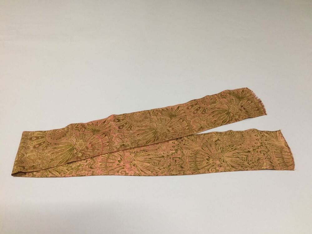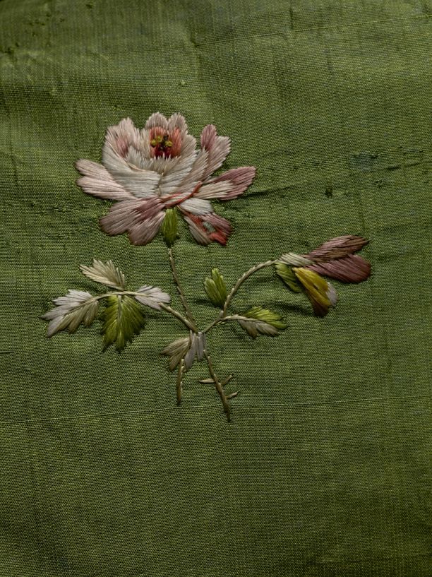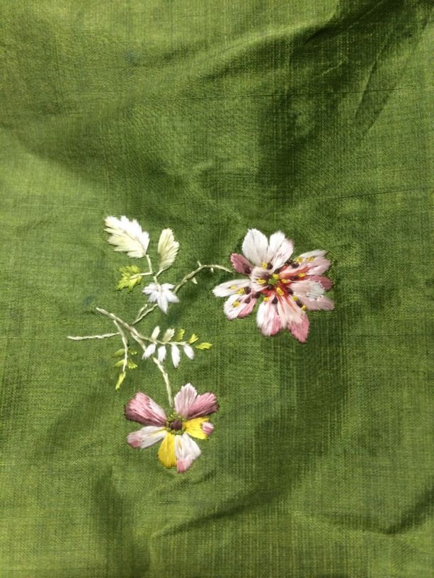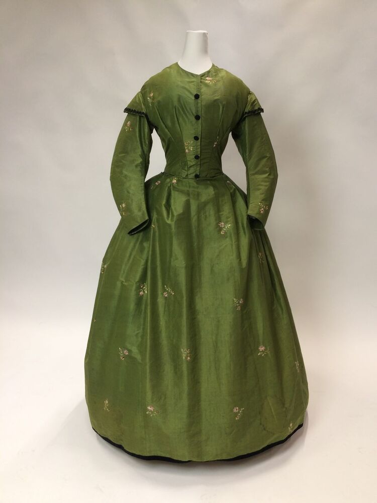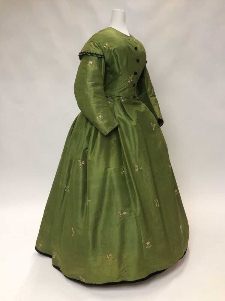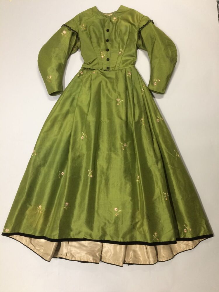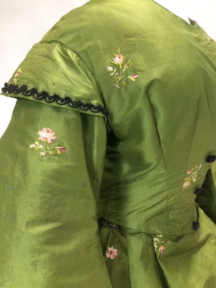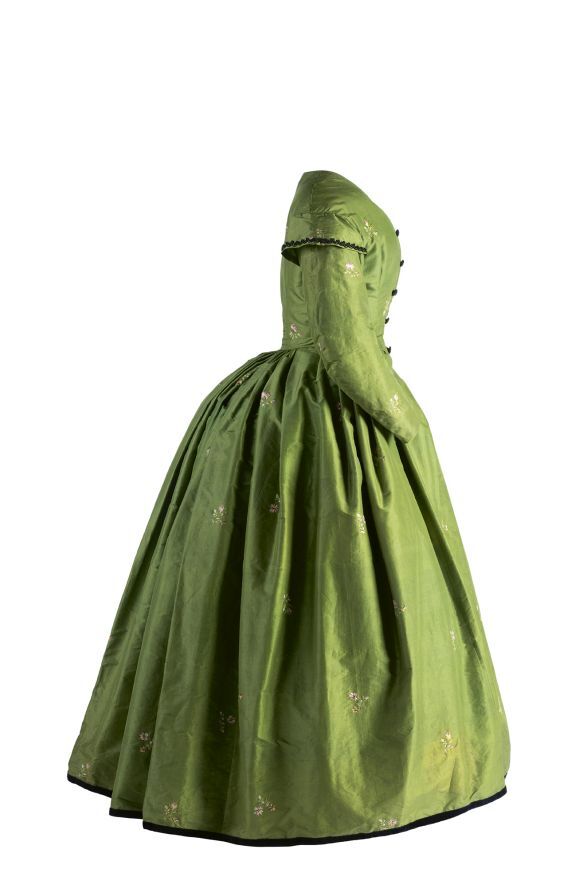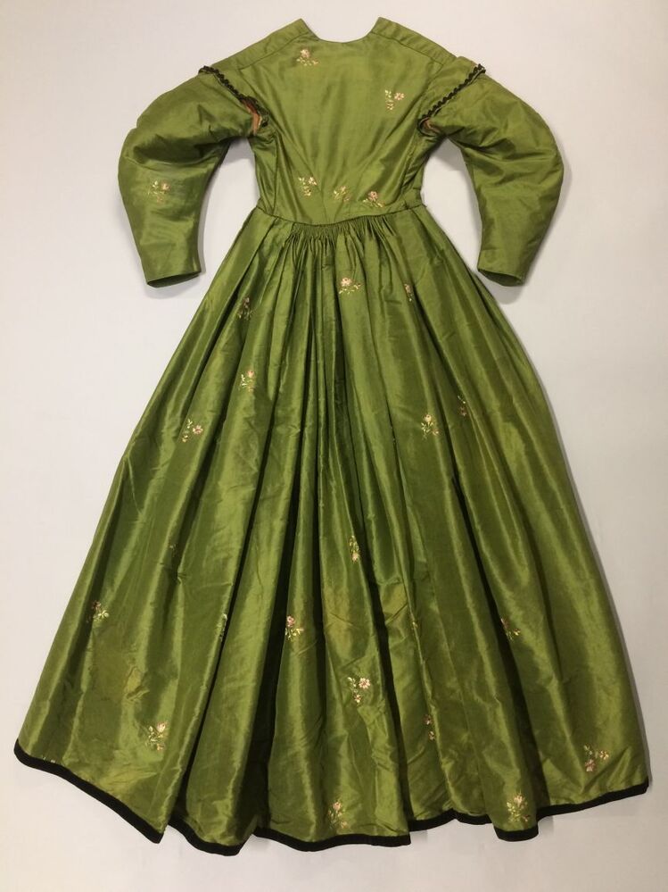 Japon met wijde tournure-rok van groene taftzijde met geborduurde bloempjes, gemaakt van Biedermeier stof
