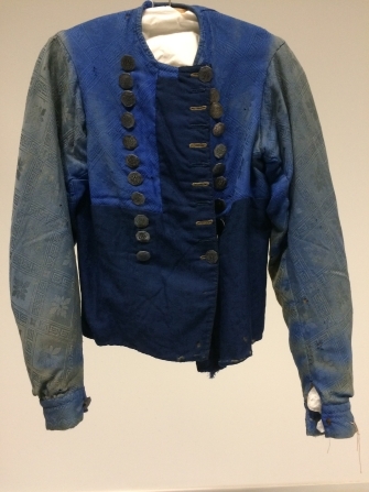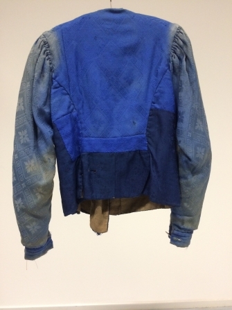 Baeitje van verschillende stukken blauwe damast met bloemen
