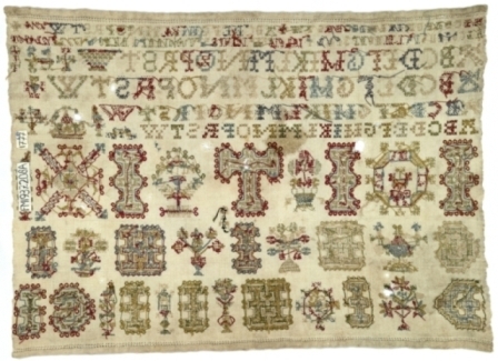 Lettermerklap met veel initialen, gemerkt Jeltje Joikes, oud 10 jaar anno 1777