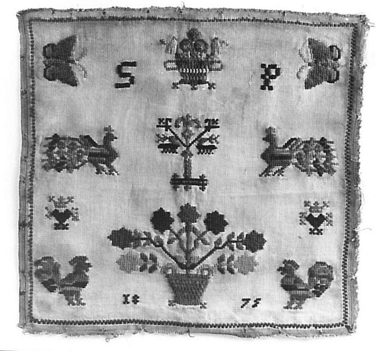 Lettermerklap geborduurd met wol, gemerkt SP 1875