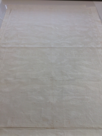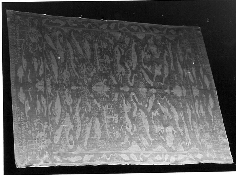 Servet van wit linnen damast met voorstelling van zeedieren, schip en wapens en namen van Scipio Meckama van Aylva en Lucia van Eysinga, 1661, spiegelend geweven