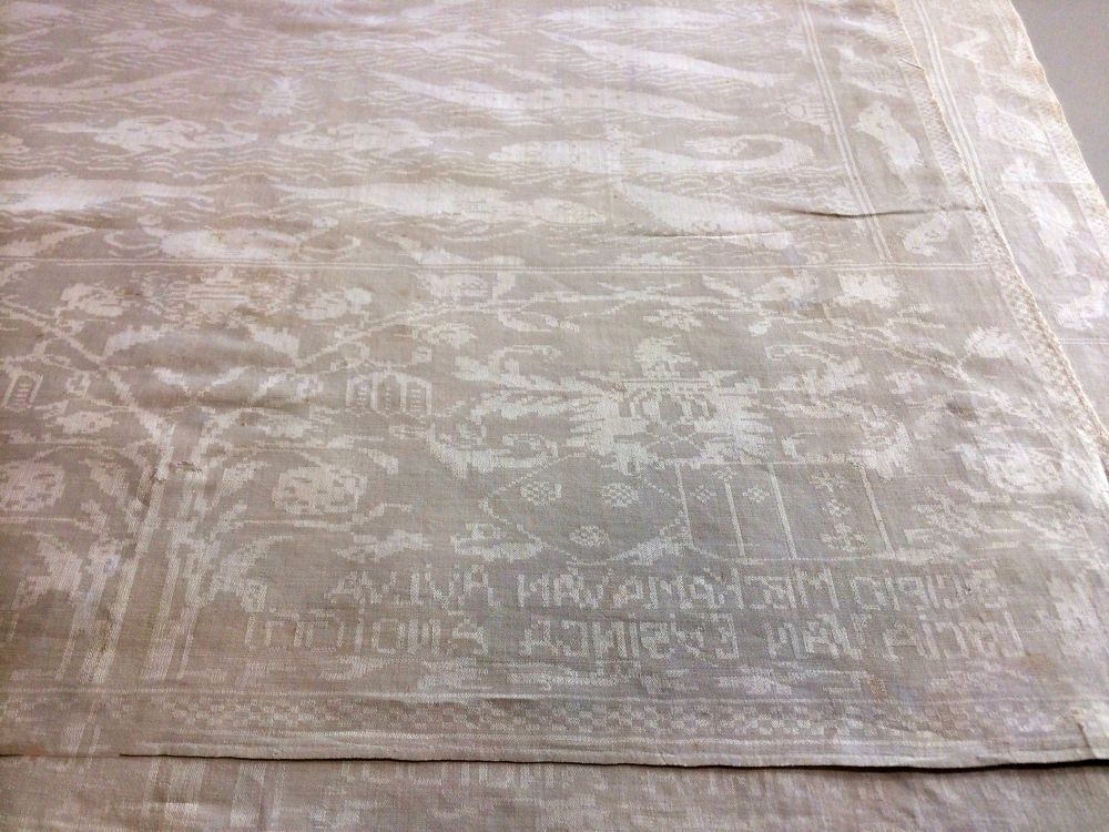 Servet van wit linnen damast, met voorstelling van zeedieren, schip en wapens en namen van Scipio Meckama van Aylva en Lucia van Eysinga, 1661, spiegelend geweven,