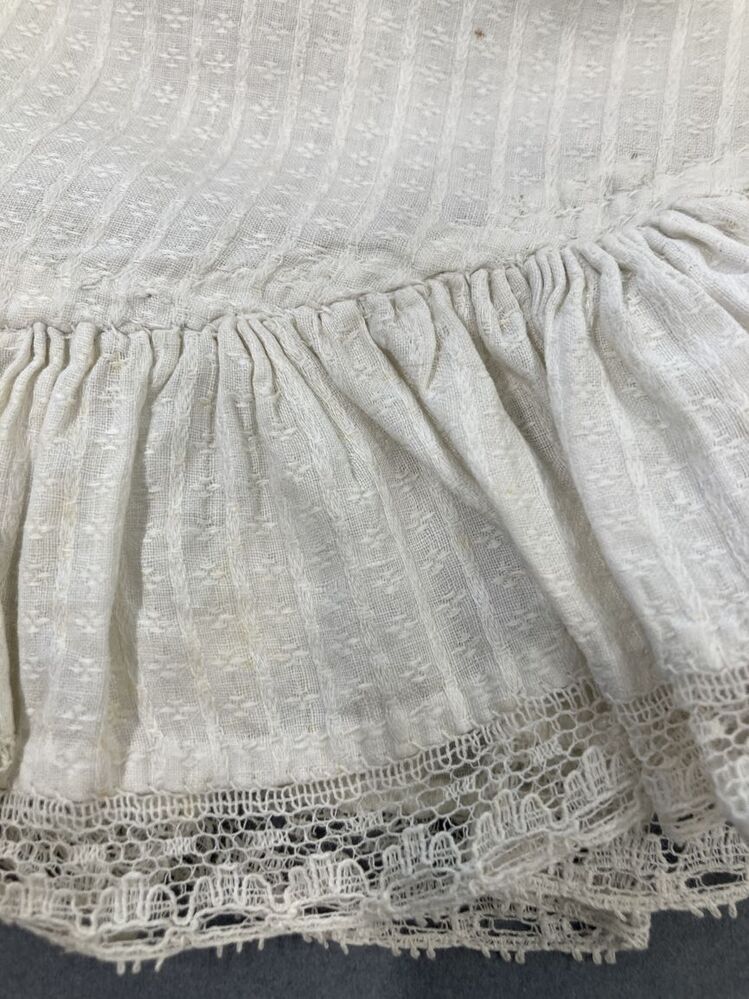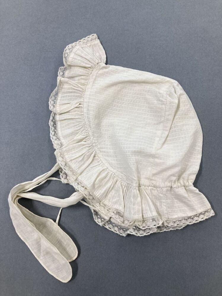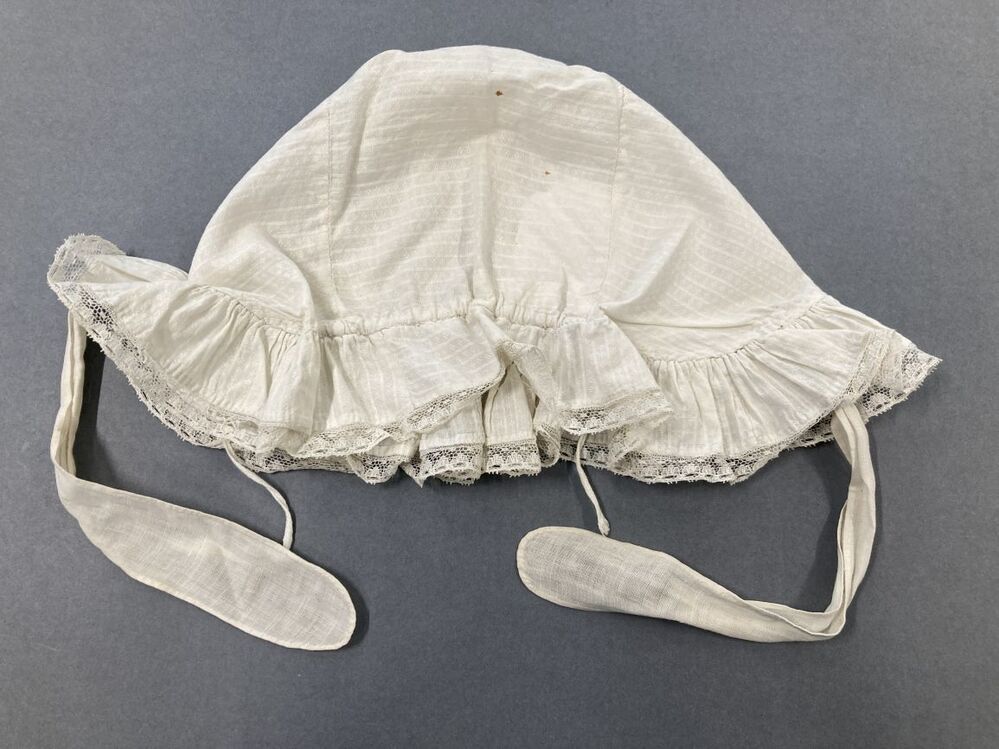 Muts van wit piqué met banden en rondgaand strook met smal randje kant